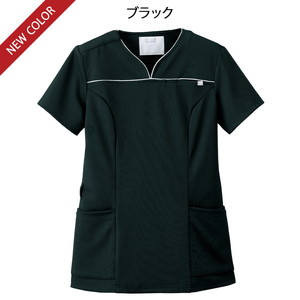 胸元のパイピングが、女性らしい上品な印象を与えるスクラブ