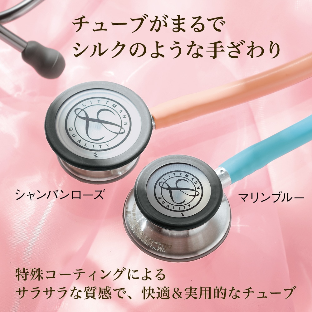 リットマン(R) 聴診器の新しいシルク調仕上げシリーズ(マリンブルー、シャンパンローズのみ)は、チューブに特殊コーティングが施されています。