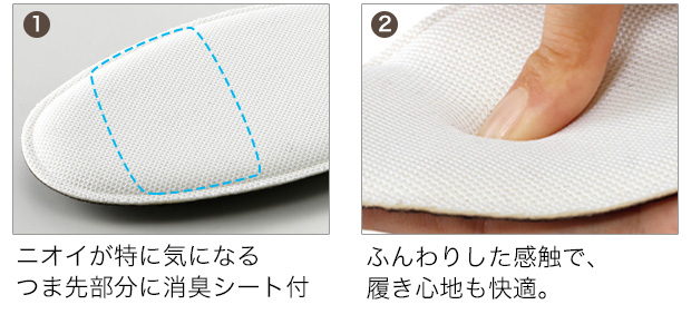 - 内側に消臭シートを内蔵した、やわらかインソール入り