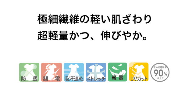 極細繊維のさらりとした軽い肌ざわりの超軽量ストレッチ素材。