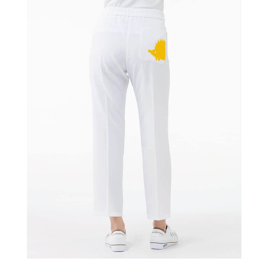 ブランドアイコンのハリネズミをチクっと効かせたら、メディカルウェアなりのシンプルスタイルが完成。