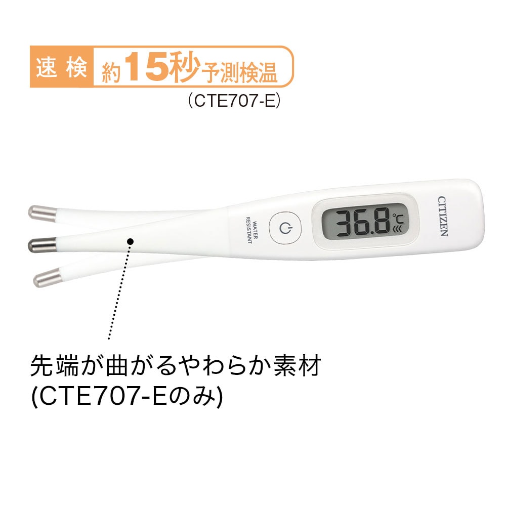 ○速検/約15秒予測検温(CTE707-E)・先端が曲がるやわらか素材(CTE707のみ)