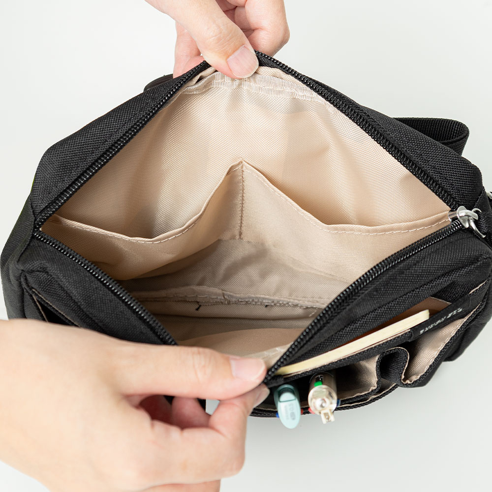 - スマートフォン、ペン、はさみ、メモ帳など細々とした物を収納できる