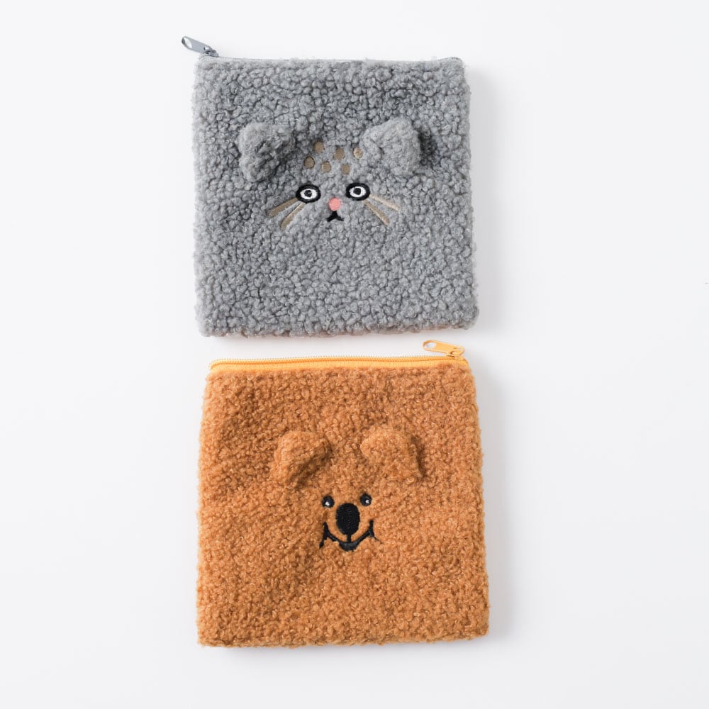 ふわふわの生地に、クォッカワラビーとマヌルネコの刺繍が入ったポーチ。