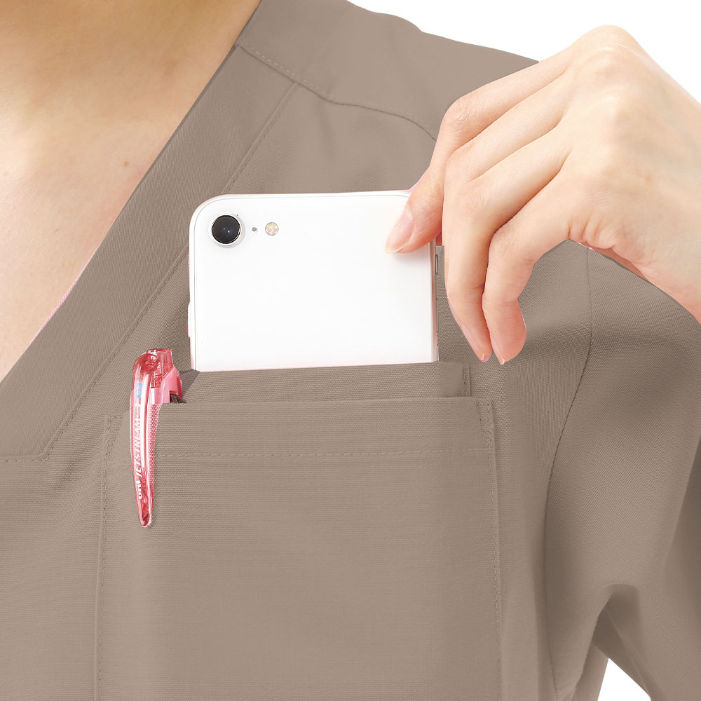 パイピング入りの胸ポケットには、仕分けのPHSポケット付